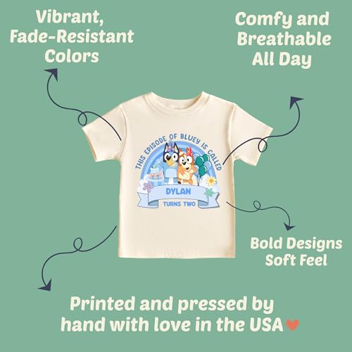 We offer this delightful shirt in two charming styles: a playful blue version for boys and a sweet pink option for girls. Each design is infused with the adorable essence of a playful puppy, making it a whimsical addition to any birthday celebration. Hand-pressed in the USA, our shirts guarantee quality craftsmanship with careful attention to detail.