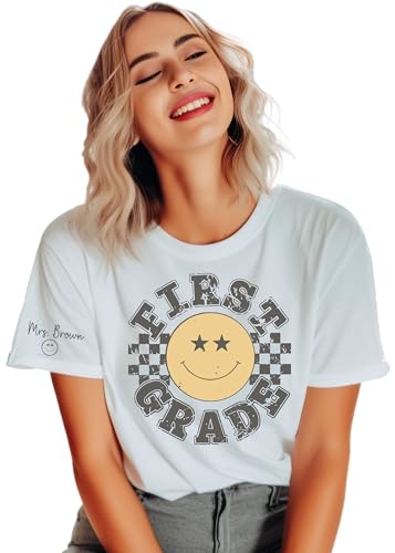 Retro Teacher Shirts First Grade Teacher Shirt 1st Grade Teacher TShirt Back to School TShirt Custom Teacher Outfits Smiling Face Checkered Shirt Vintage Teacher Appreciation Gift Personalized